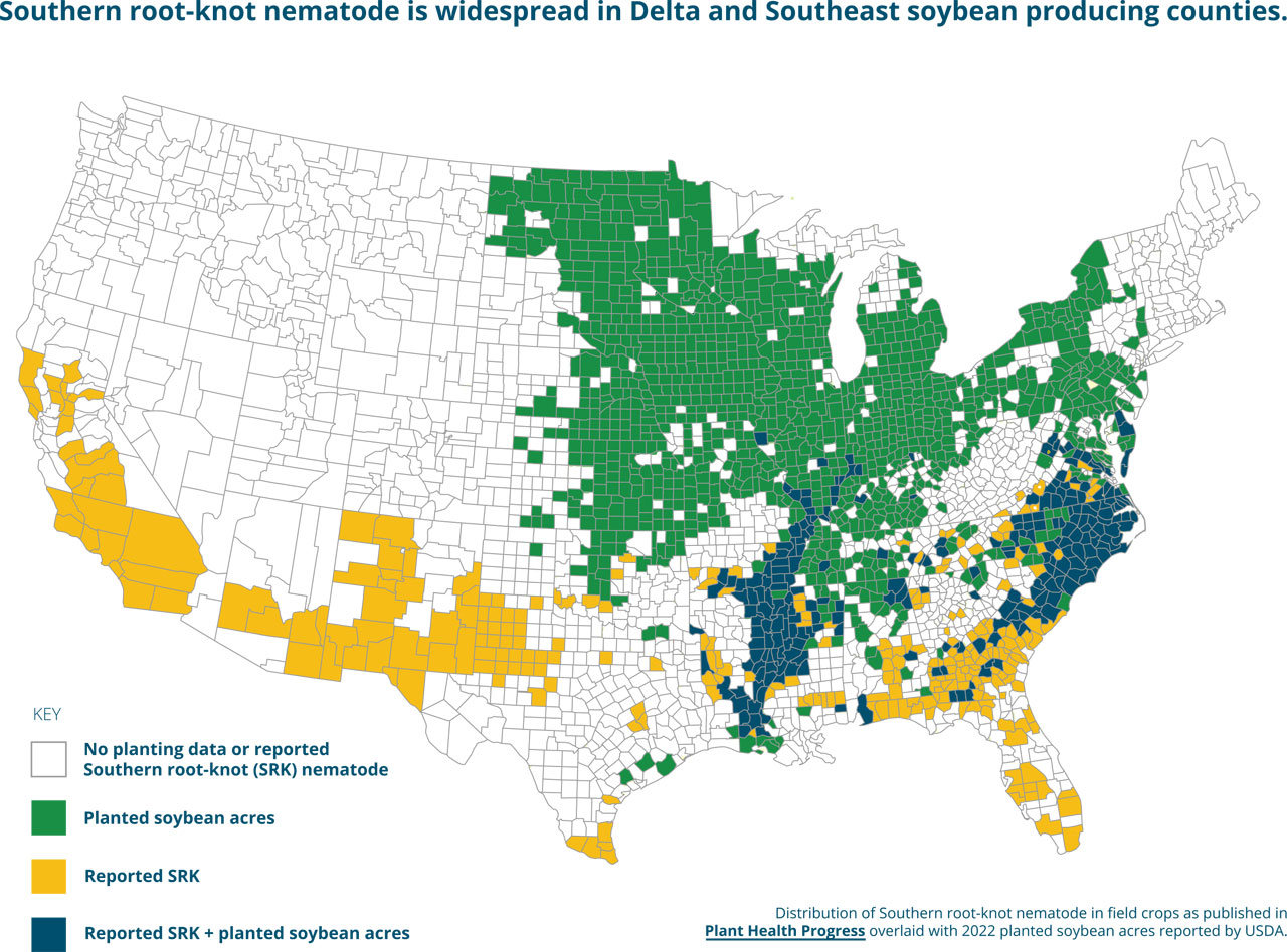 Found in most soybean-growing regions in the U.S., root-knot nematode (RKN) causes up to 25% yield loss, costing farmers millions in revenue. When high RKN pressure coincides with stressful environmental conditions such as drought, yield reductions can become even more severe.